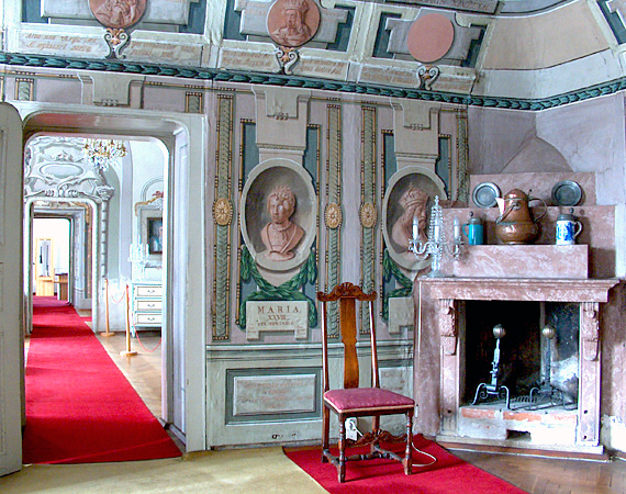 Mramorom obložený krb v dámskom salóne vybudovali v 2. polovici 19. storočia. Drevené obloženie stien je zdobené pozláteným vzorom v luiséznom štýle. Rokokový mobiliár, dve benátske zrkadlá a krajinomaľby z prelomu 18. a 19. storočia vytvárajú útulnú atmosféru posedenia pri čaji.
