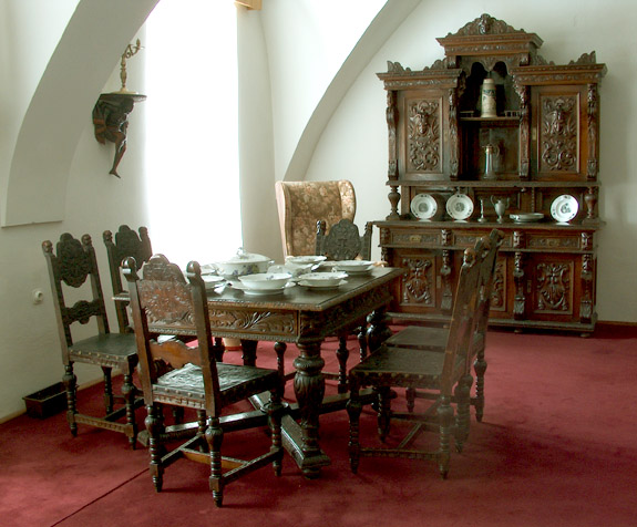 V miestnosti zariadenej ako jedáleň sa nachádza veľká nábytková súprava z prelomu 19. a 20. storočia doplnená porcelánom z manufaktúr v Karlových Varoch a Dubí pri Tepliciach. Príborníky ukrývajú cínový riad z konca 18. storočia, porcelán a sklo z 19. a 20. storočia. Na stenách visia obrazy "Zátišie" a " Exotické vtáky", medzi príborníkmi olej na plátne nazvaný "Interieur" z roku 1673, ktorého autorom je holanďan Lambert Doomer. Ako zaujímavosť si zaslúži pozornosť vyrezávaný konár s motívom znetvorených tvári - maskarónov.