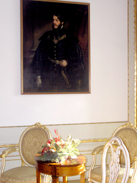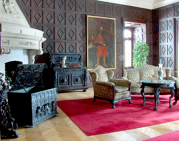 Pánske krídlo kaštieľa charakterizuje tmavé dubové obloženie stien. Zariadenie prijímacieho salónu pochádza prevažne z 1. polovice 19. storočia a nesie znaky empírového slohu. Portréty Dionýza Andrássyho a jeho manželky Františky /majiteľov Krásnej Hôrky/ v rokoch 1903 a 1904 namaľoval Gabriel Schachinger a rodovú galériu dopĺňa Juarj Andrássy, Dionýzov otec a podobizeň Kláry Zichy /najmladšej dcéry Žigmunda Drugetha/ zo 17. storočia.