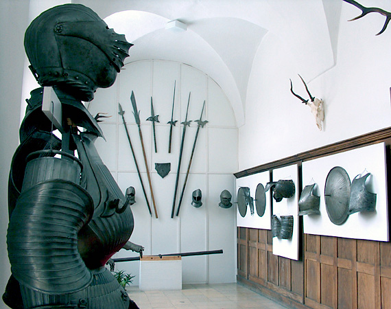 Brnenia, ochranné štíty, kópie, halapartne, ale aj malý mažiar/delo zo 17. storočia/ inštalované v tejto časti patrili tiež do andrássyovskej zbierky.