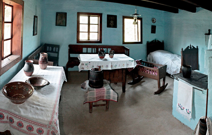 Prehliadka expozície začína v objekte obytného trojpriestorového zrubového domu bez hospodárskej časti, pozostávajúci z izby, siene a komory. Bol postavený pred 1. svetovou vojnou v Klenovej a do skanzenu presťahovaný v roku 1977. Steny sú zhotovené z tesaných trámov, spojené v rohoch zrubením a omastené hlinou. Je to charakteristická usadlosť chudobného roľníka s pomerne skromným interiérom slúžiacim na základné pokrytie životných potrieb. Inventár pozostával iba z nevyhnutných kusov nábytku, ktorý bol zväčša sústredený v obytnej miestnosti.